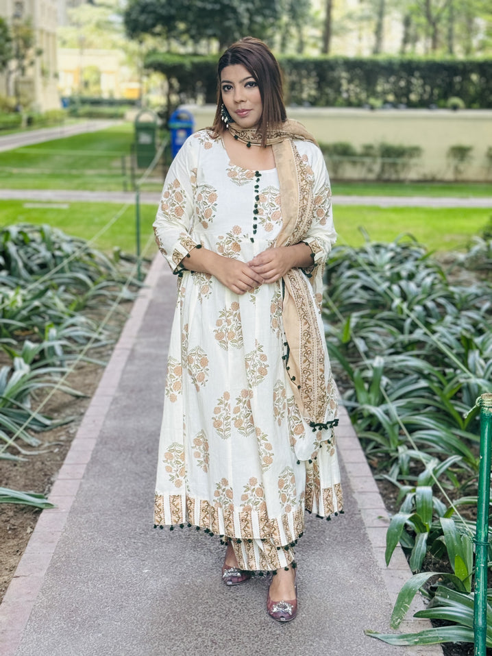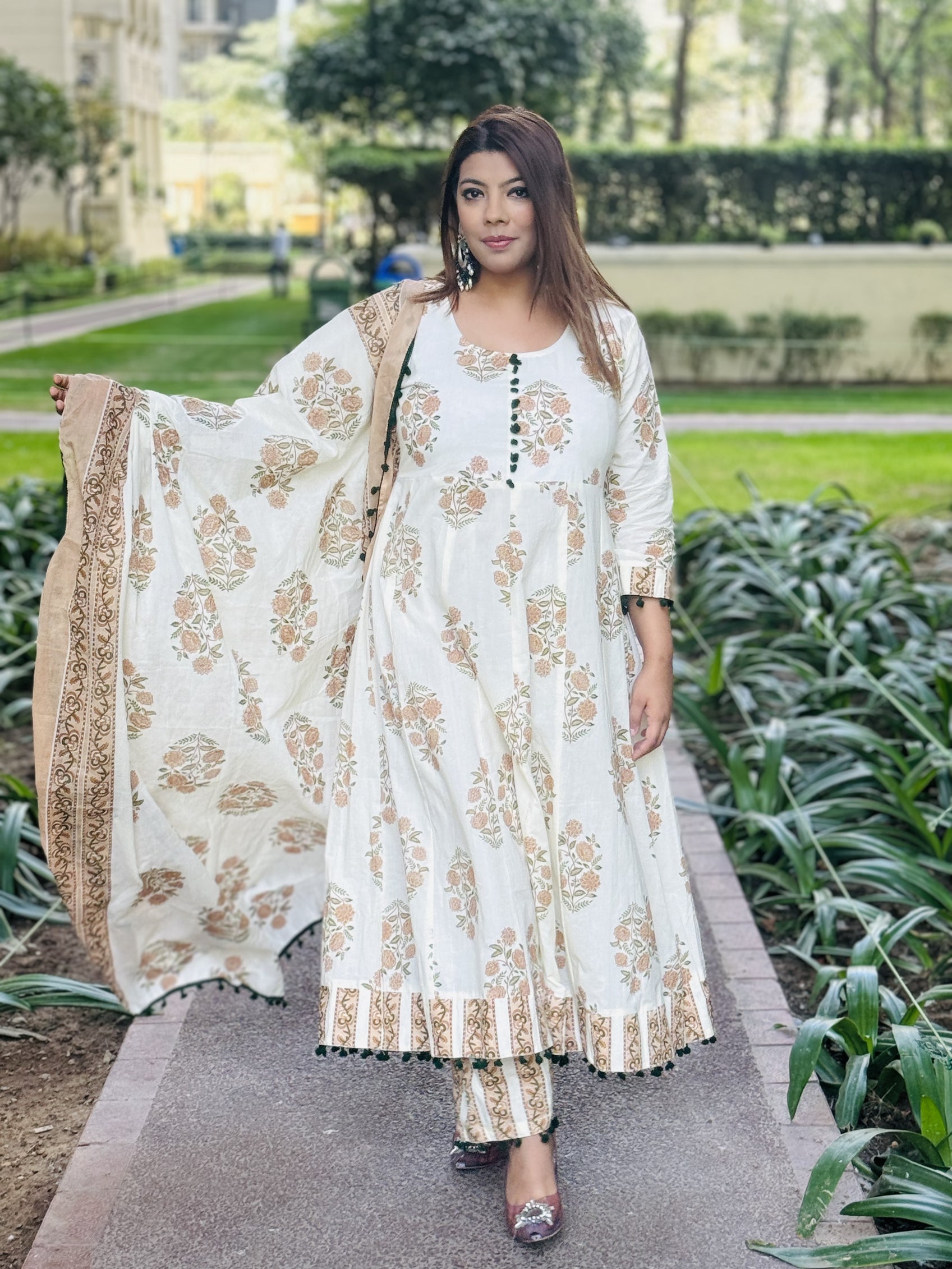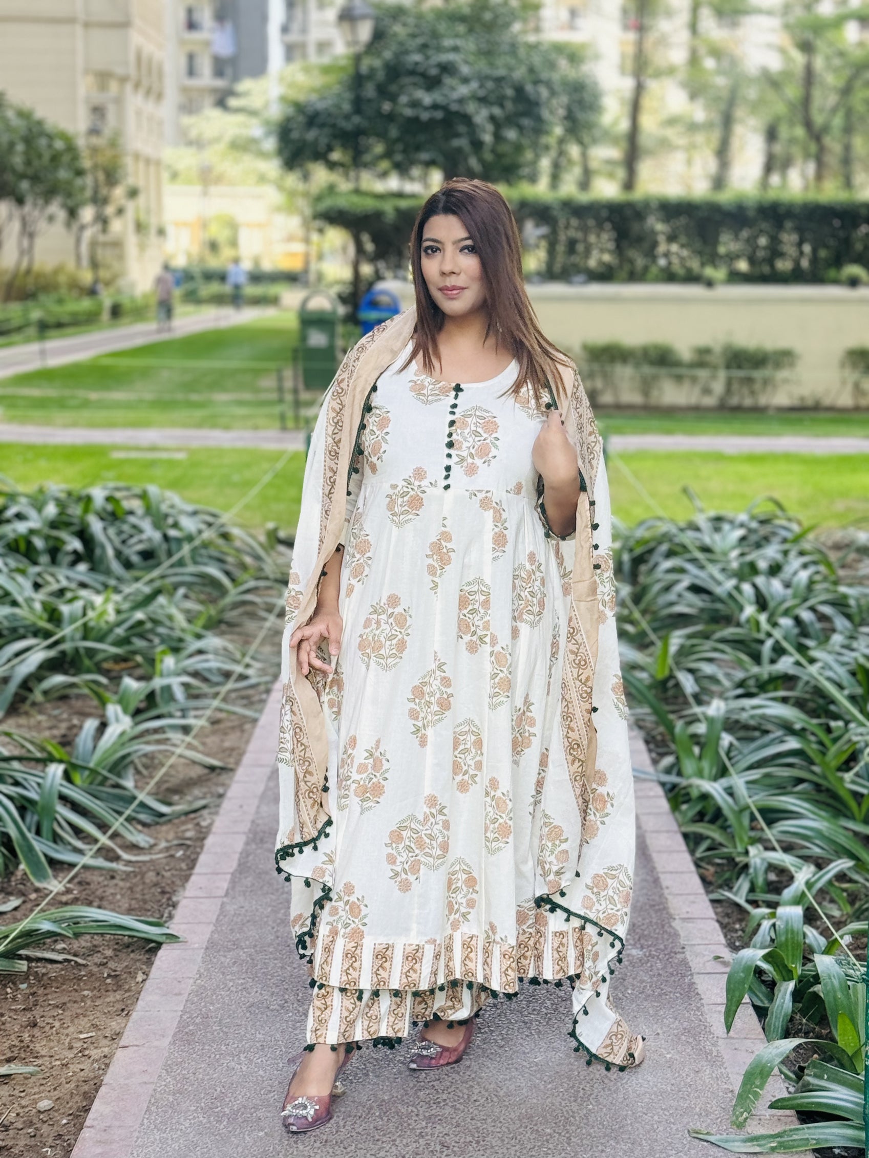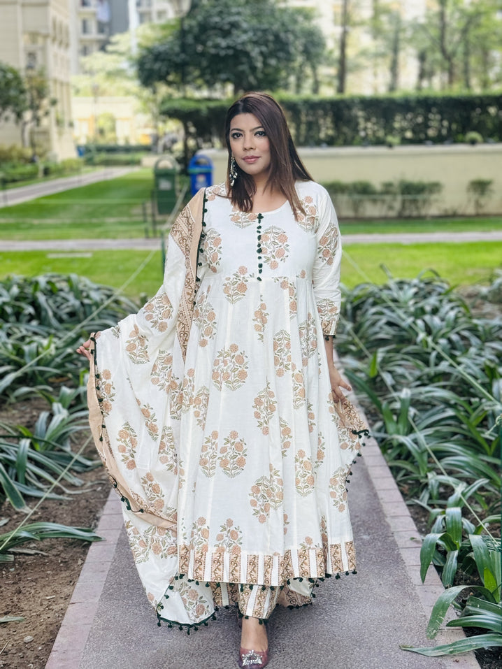 Step into elegance with our Cream Gold Green Block Printed Anarkali, crafted from rich cotton. A perfect anarkali for Indian festivals, weddings, and celebrations. Available in sizes 34-46.