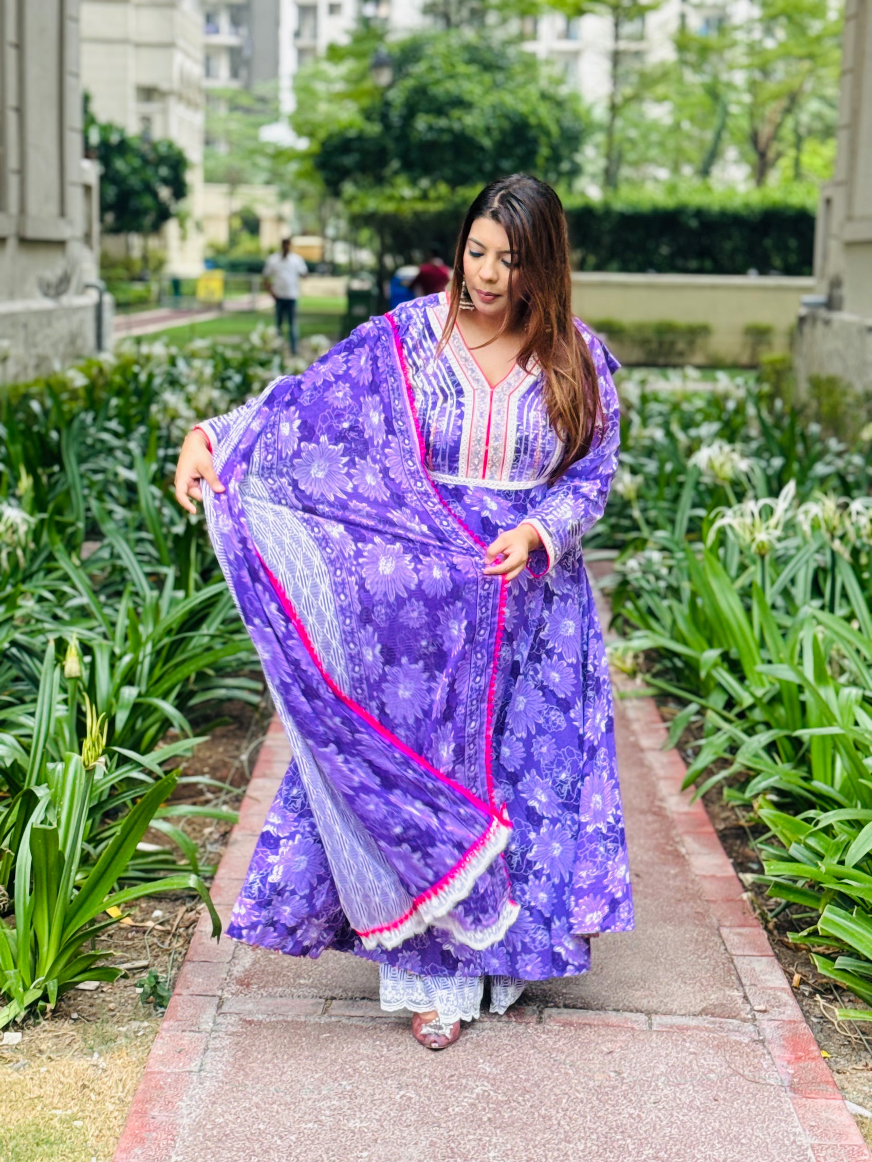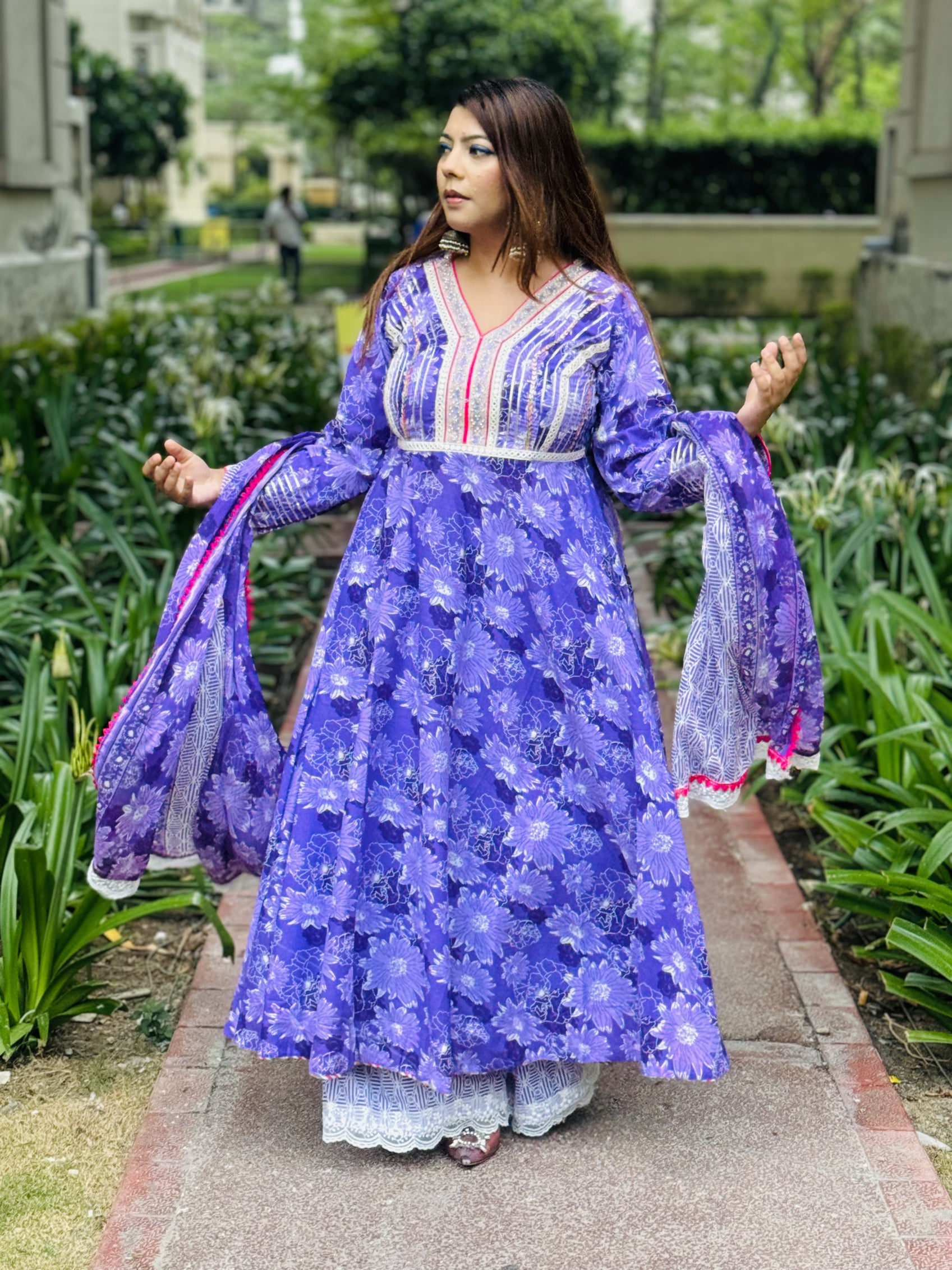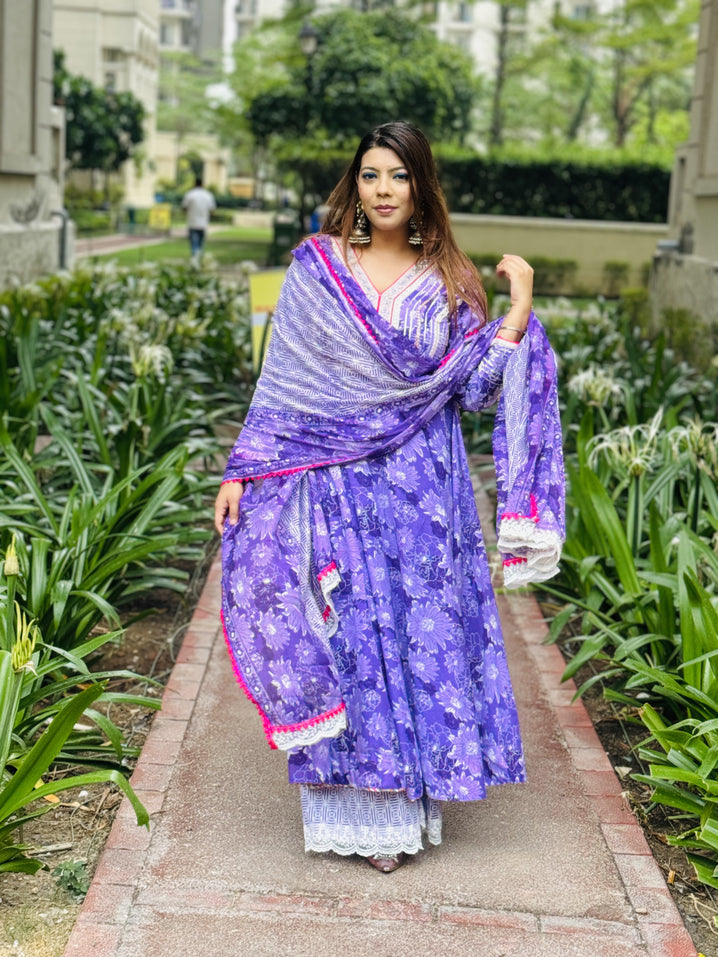 Lilac Pure Cotton Anarkali Set with Plazo & Full-Size Mul-Mul Dupatta – Sizes 34 to 46