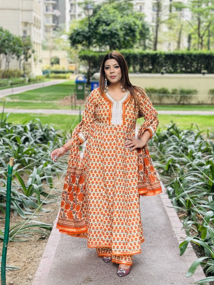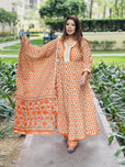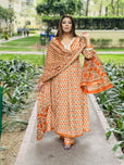 Step into elegance with our Orange Anarkali, crafted from rich cotton. A perfect anarkali for Indian festivals, weddings, and celebrations. Available in sizes 34-50.