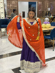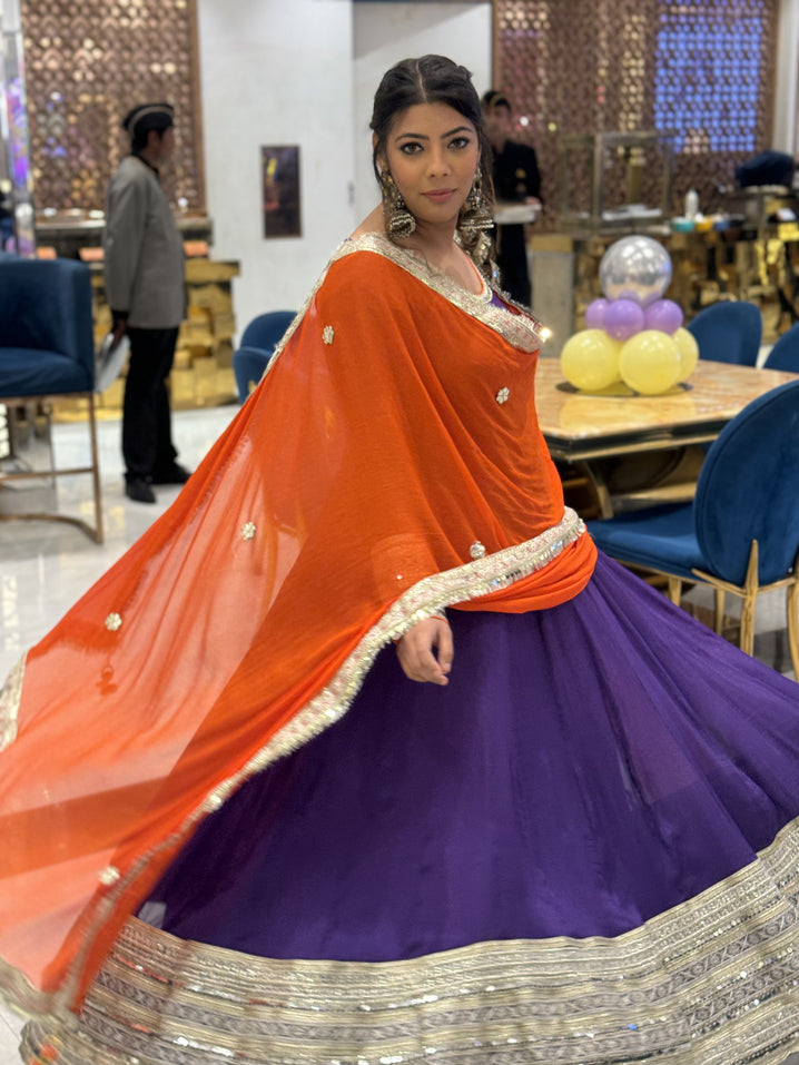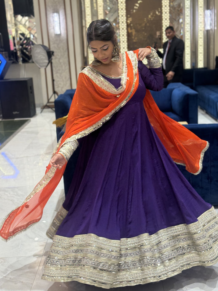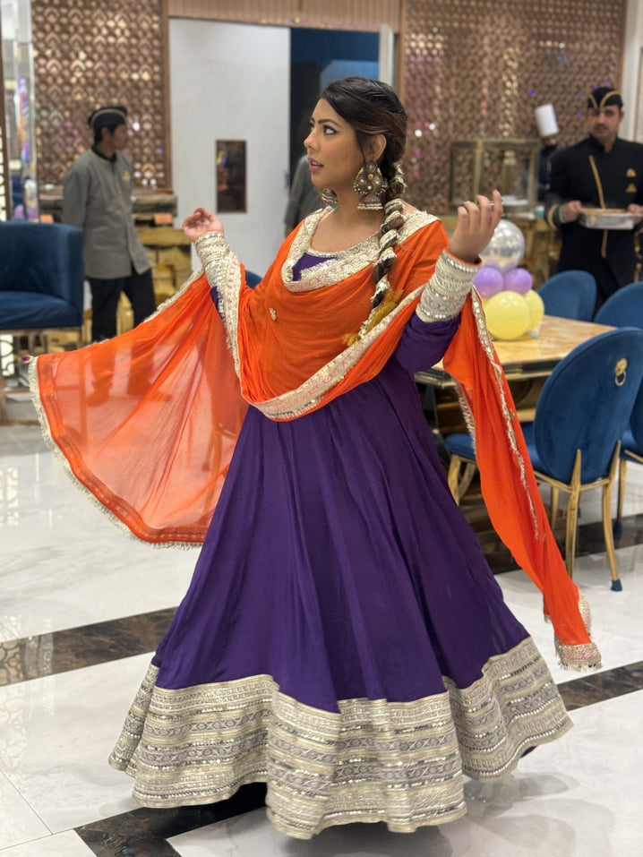 Step into elegance with our Purple Anarakli With Orange Supatta, crafted from rich chinon. A perfect anarkali for Indian festivals, weddings, and celebrations. Available in sizes 34-48.