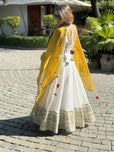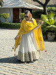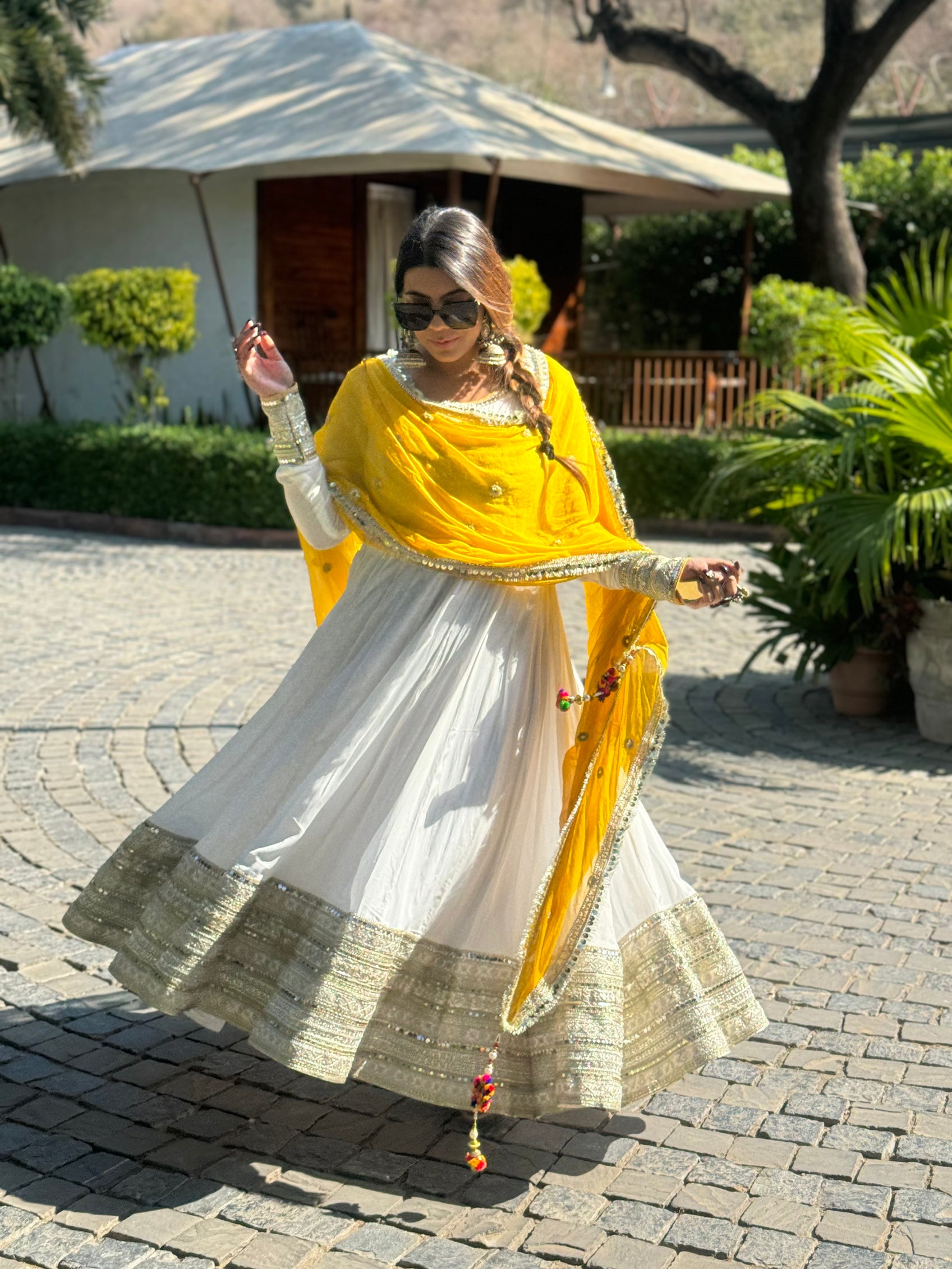Step into elegance with our White Chinon Yellow Dupatta Anarkali, crafted from rich chinon. A perfect anarkali for Indian festivals, weddings, and celebrations. Available in sizes 34-52.