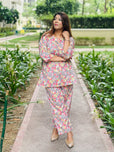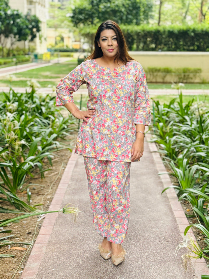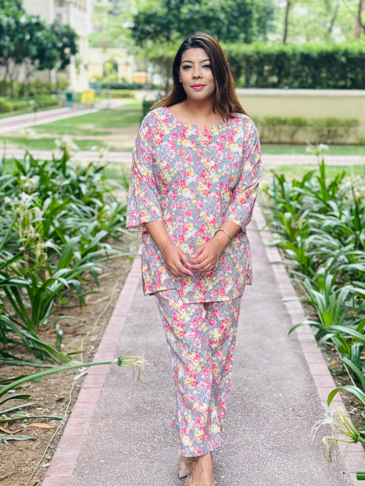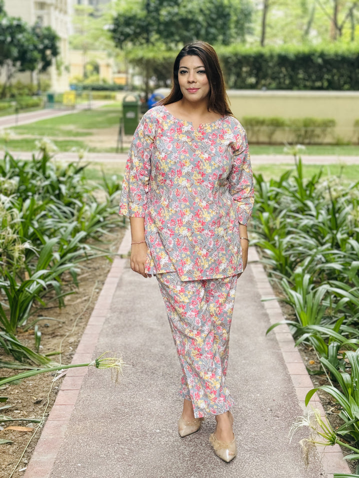 Step into elegance with our Grey Floral Coord, crafted from rich cotton. A perfect coord for Indian festivals, weddings, and celebrations. Available in sizes 34-46.