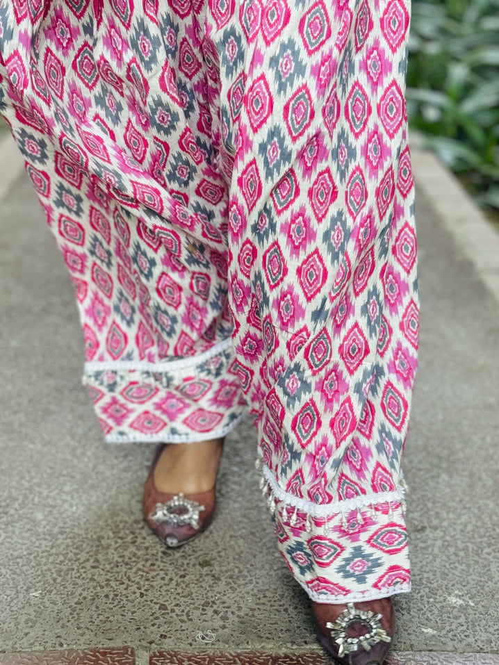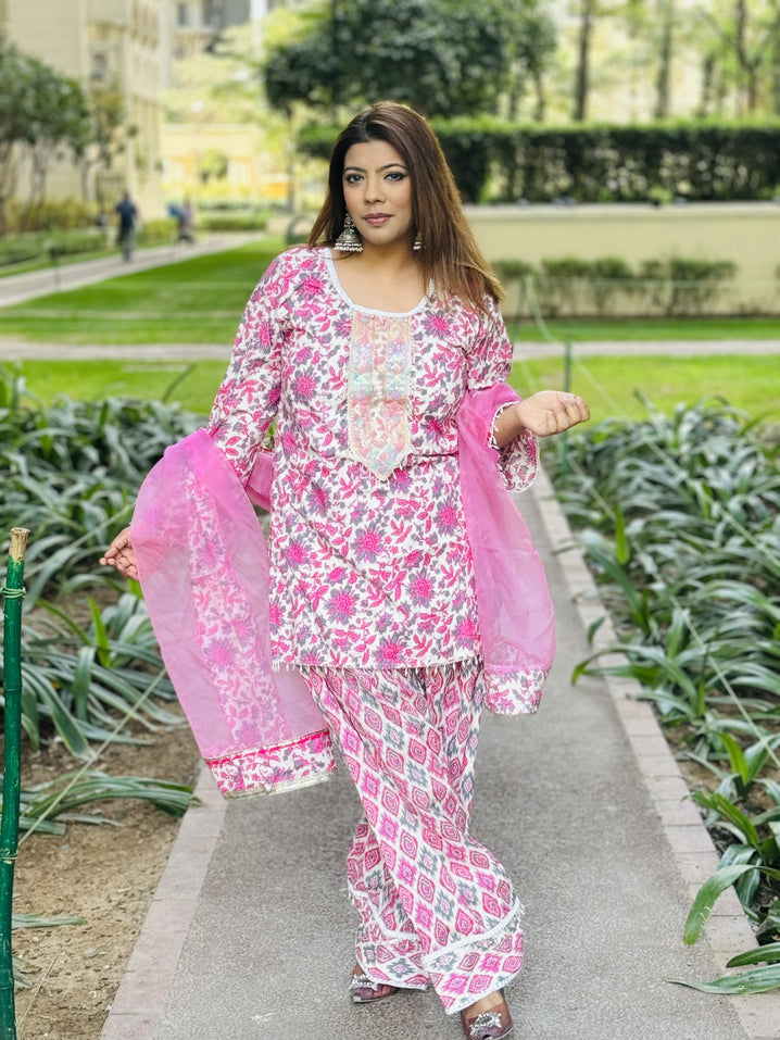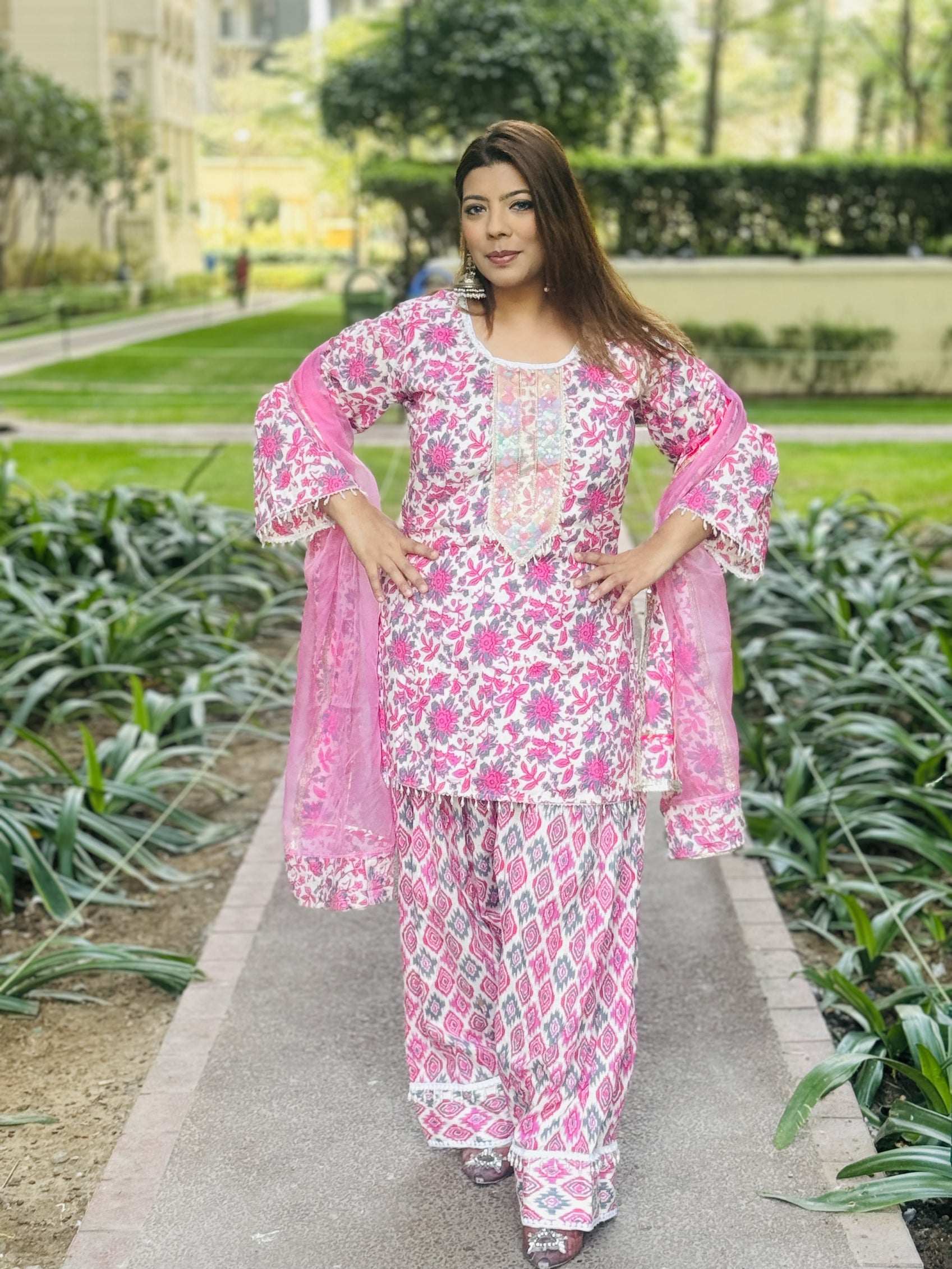 Step into elegance with our Floral Pink Farshi, crafted from rich cotton. A perfect farshi salwar for Indian festivals, weddings, and celebrations. Available in sizes 34-52.