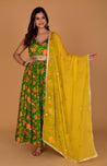 Step into elegance with our Chinon Gown Yellow Flowers, crafted from rich chinon. A perfect gown for Indian festivals, weddings, and celebrations. Available in sizes 34-44.