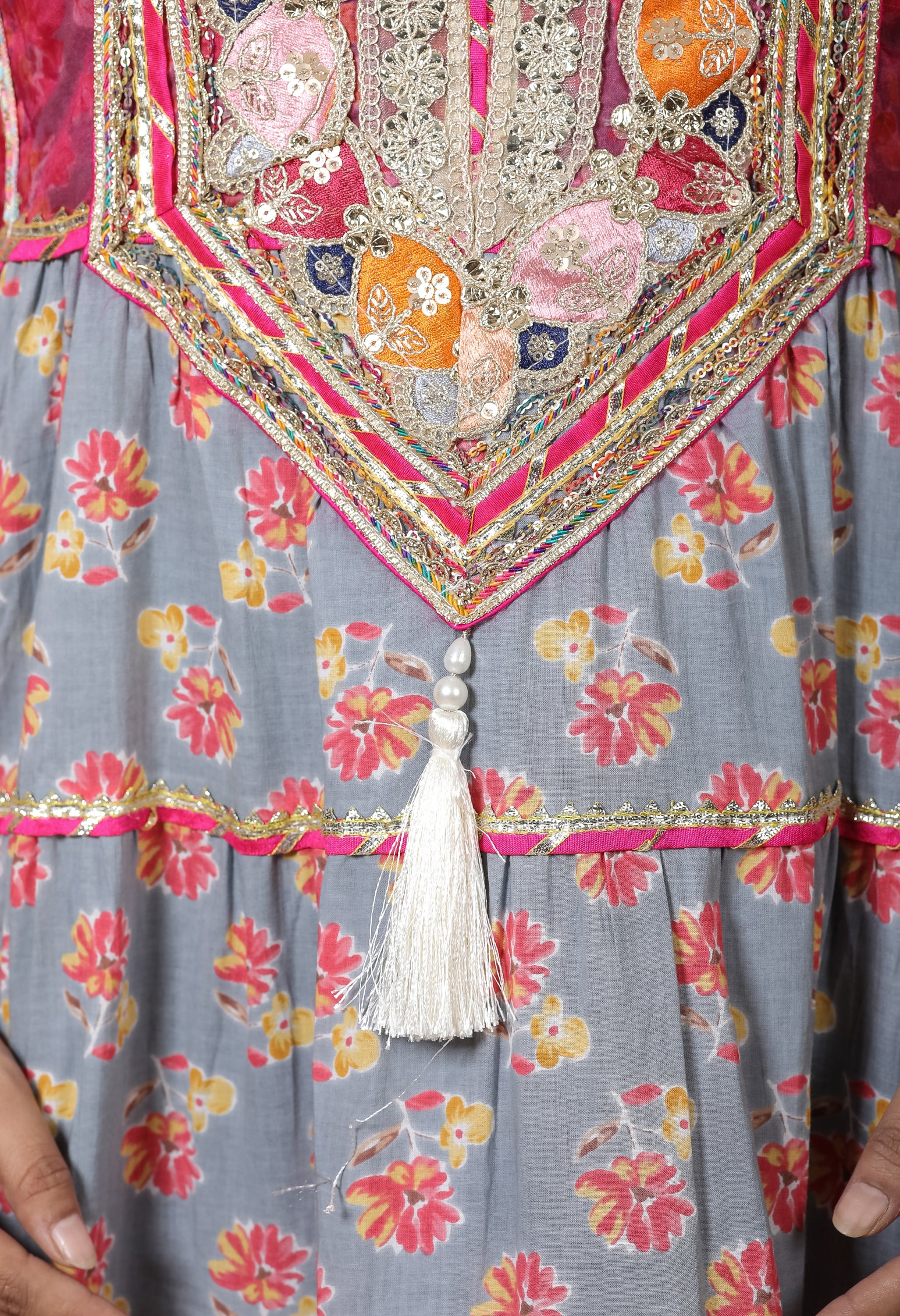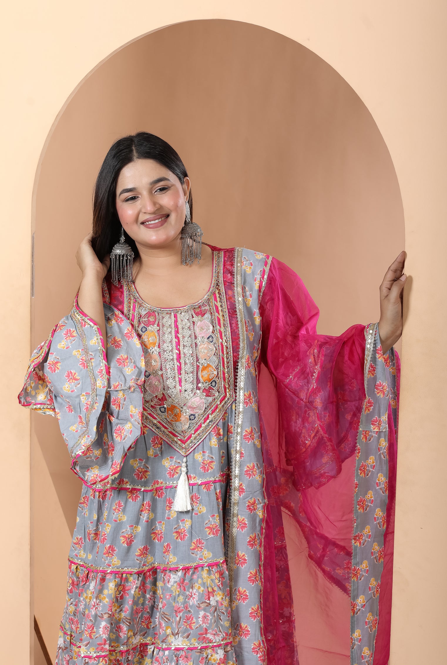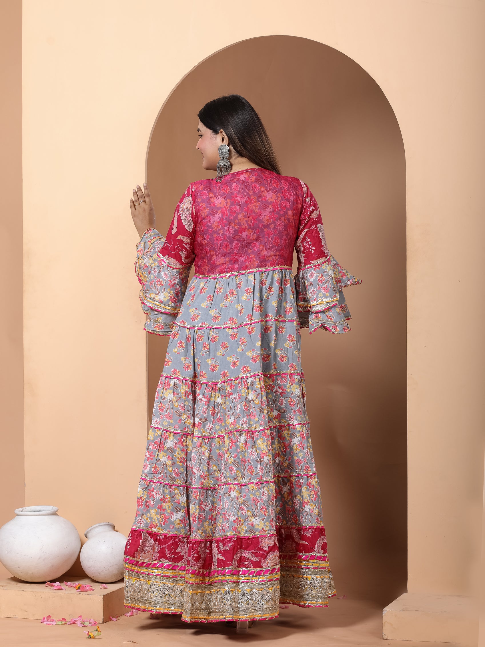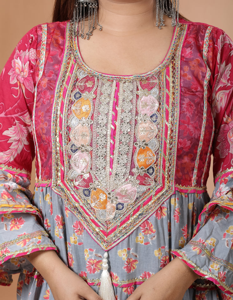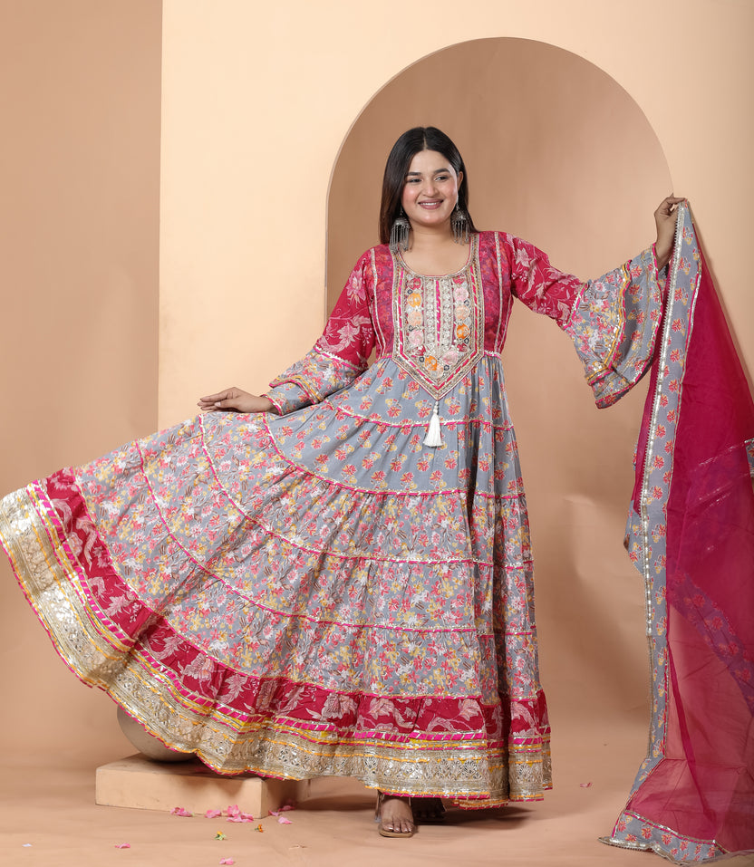 Step into elegance with our Grey Magenta Gown, crafted from rich cotton. A perfect gown for Indian festivals, weddings, and celebrations. Available in sizes 34-46.