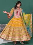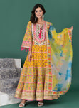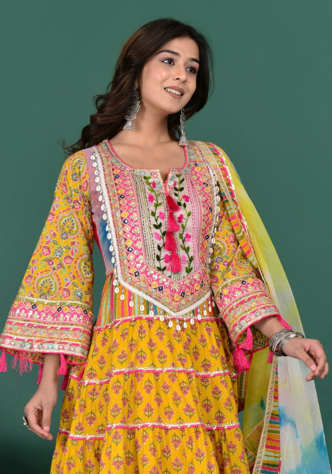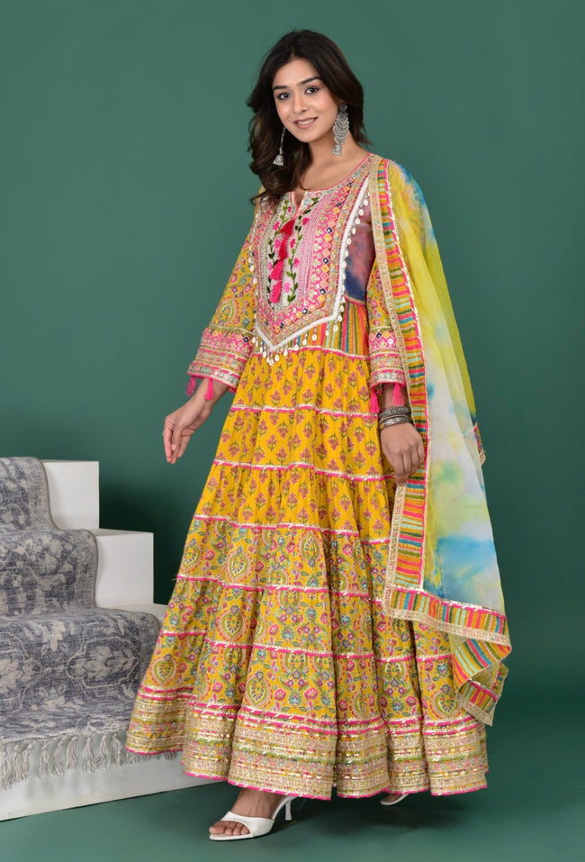 Step into elegance with our Yellow Floral Gown, crafted from rich cotton. A perfect gown for Indian festivals, weddings, and celebrations. Available in sizes 34-46.