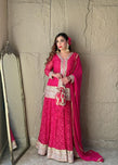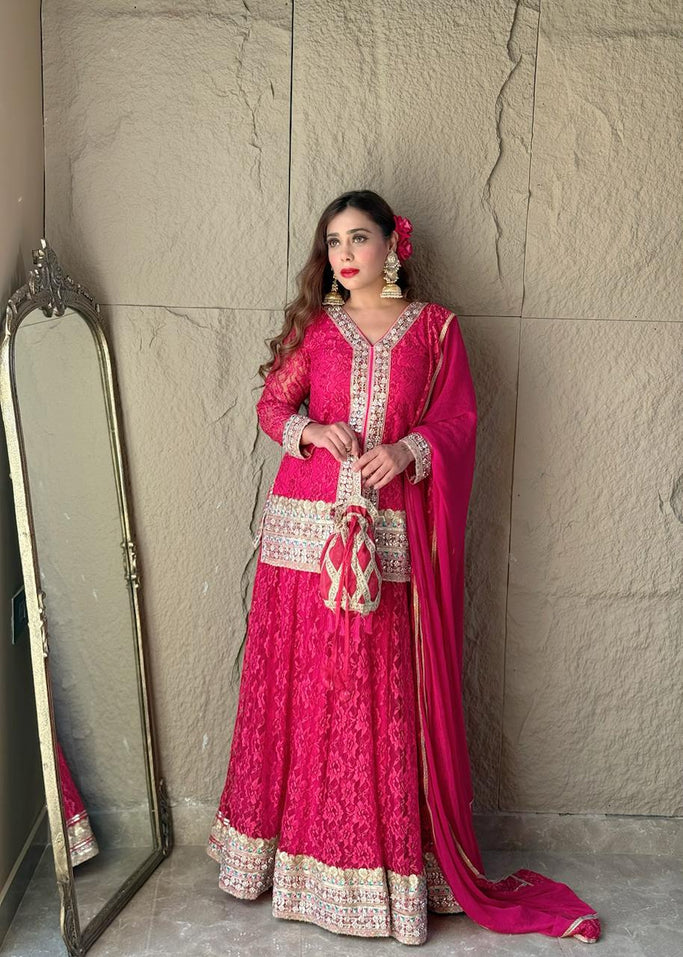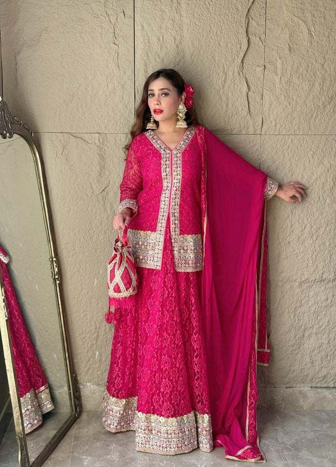 Step into elegance with our Magenta Red Flower Net Lehngha, crafted from rich net. A perfect lehnghaset for Indian festivals, weddings, and celebrations. Available in sizes 34-44.