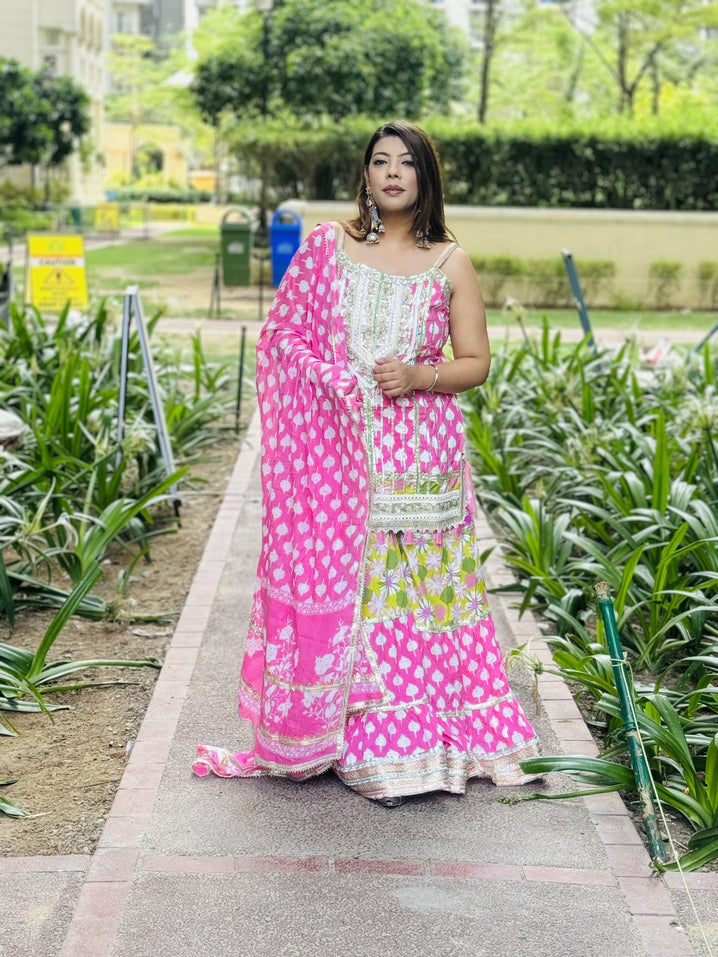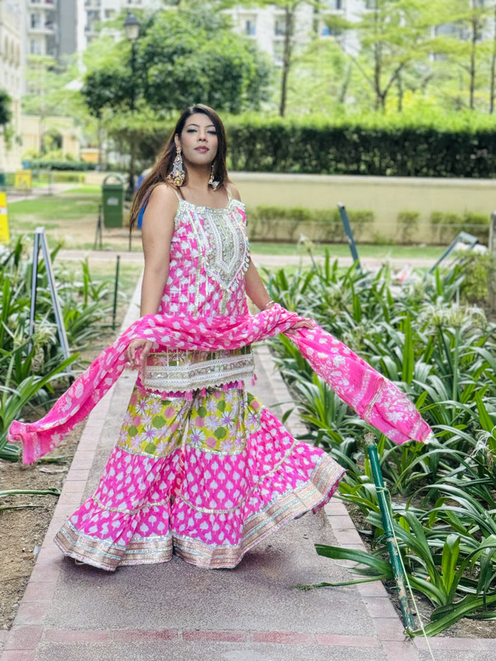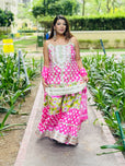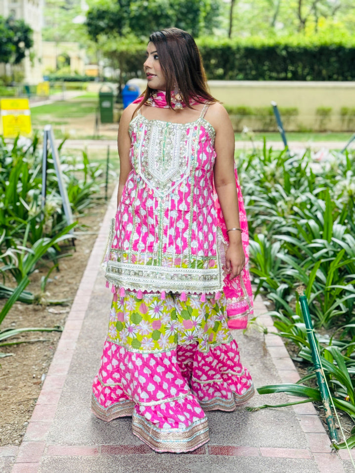 Step into elegance with our Baby Pink With Green Details Sharara, crafted from rich cotton. A perfect sharara set for Indian festivals, weddings, and celebrations. Available in sizes 34-46.