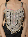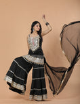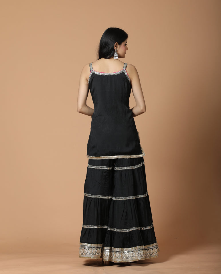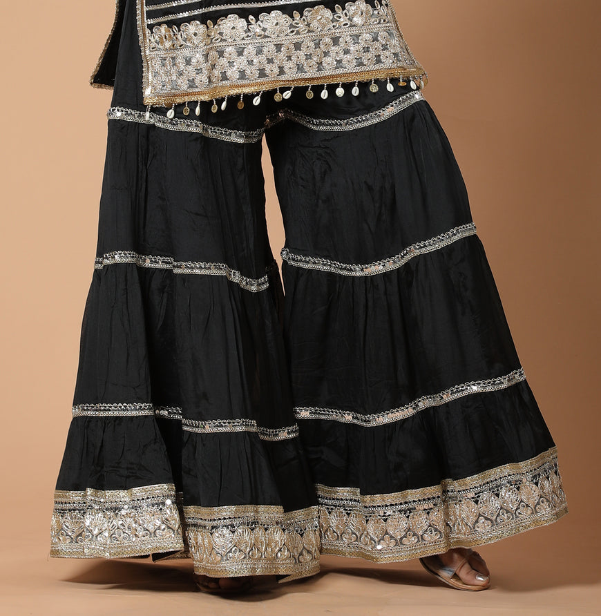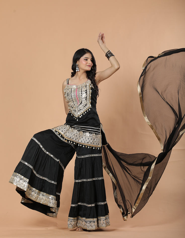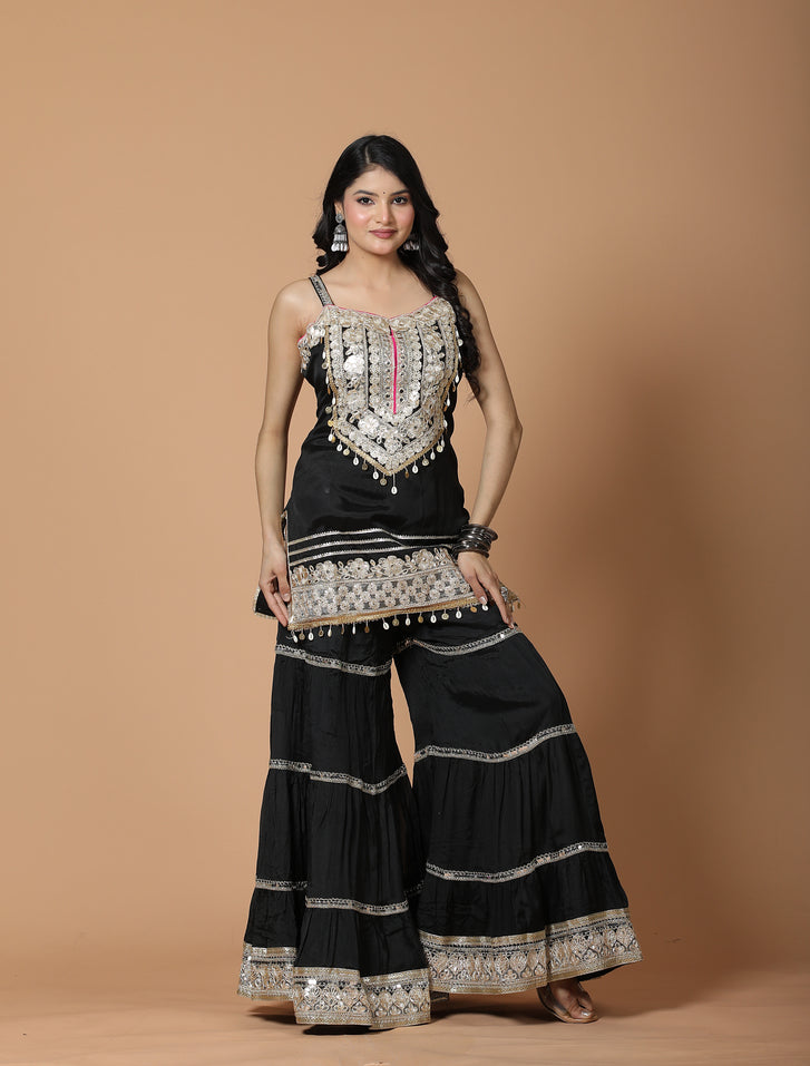Step into elegance with our Black Sharara Set Step Chinon, crafted from rich chinon. A perfect sharara set for Indian festivals, weddings, and celebrations. Available in sizes 34- 48.