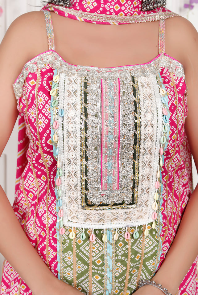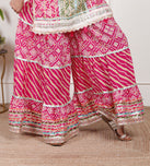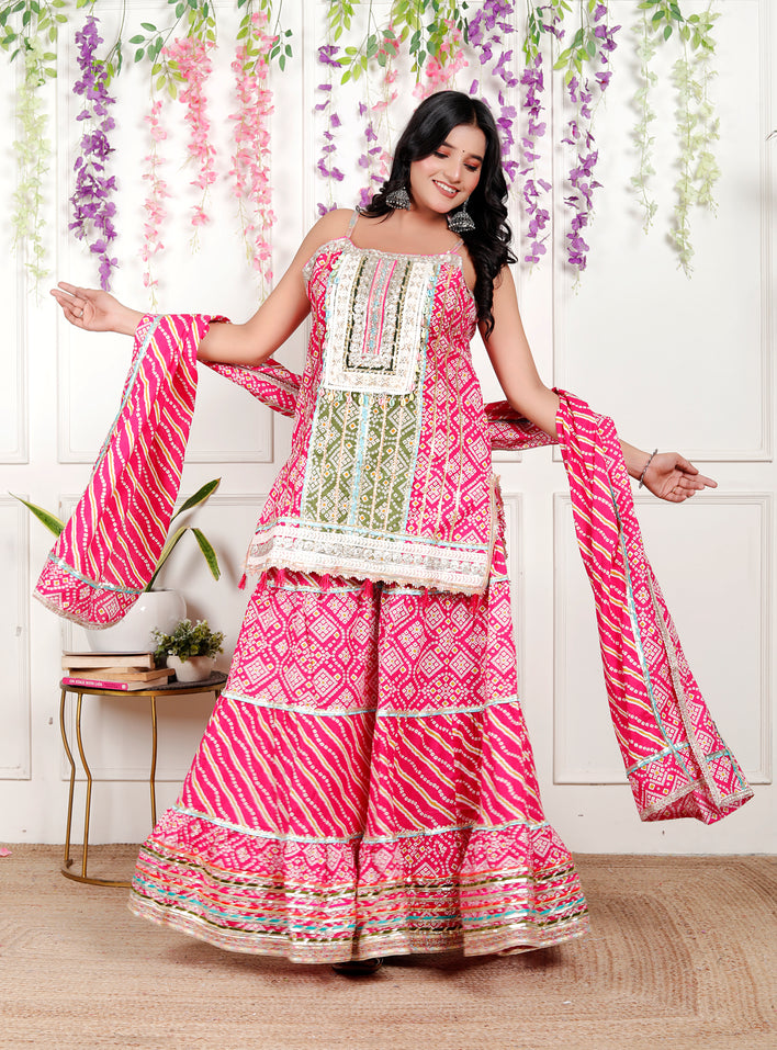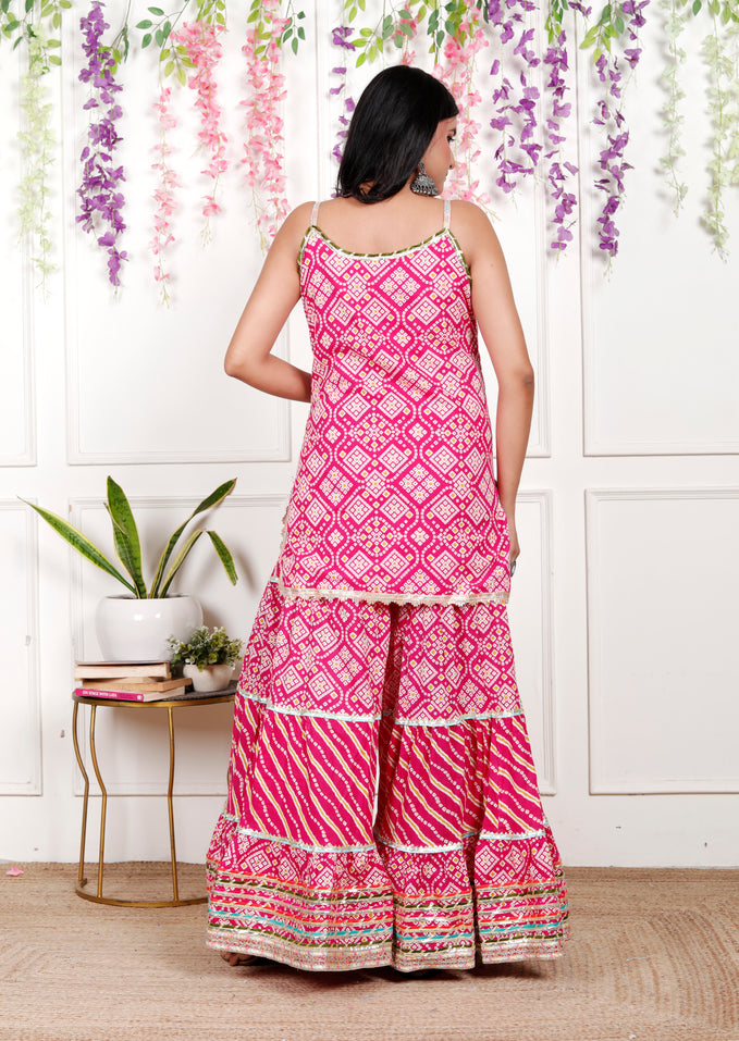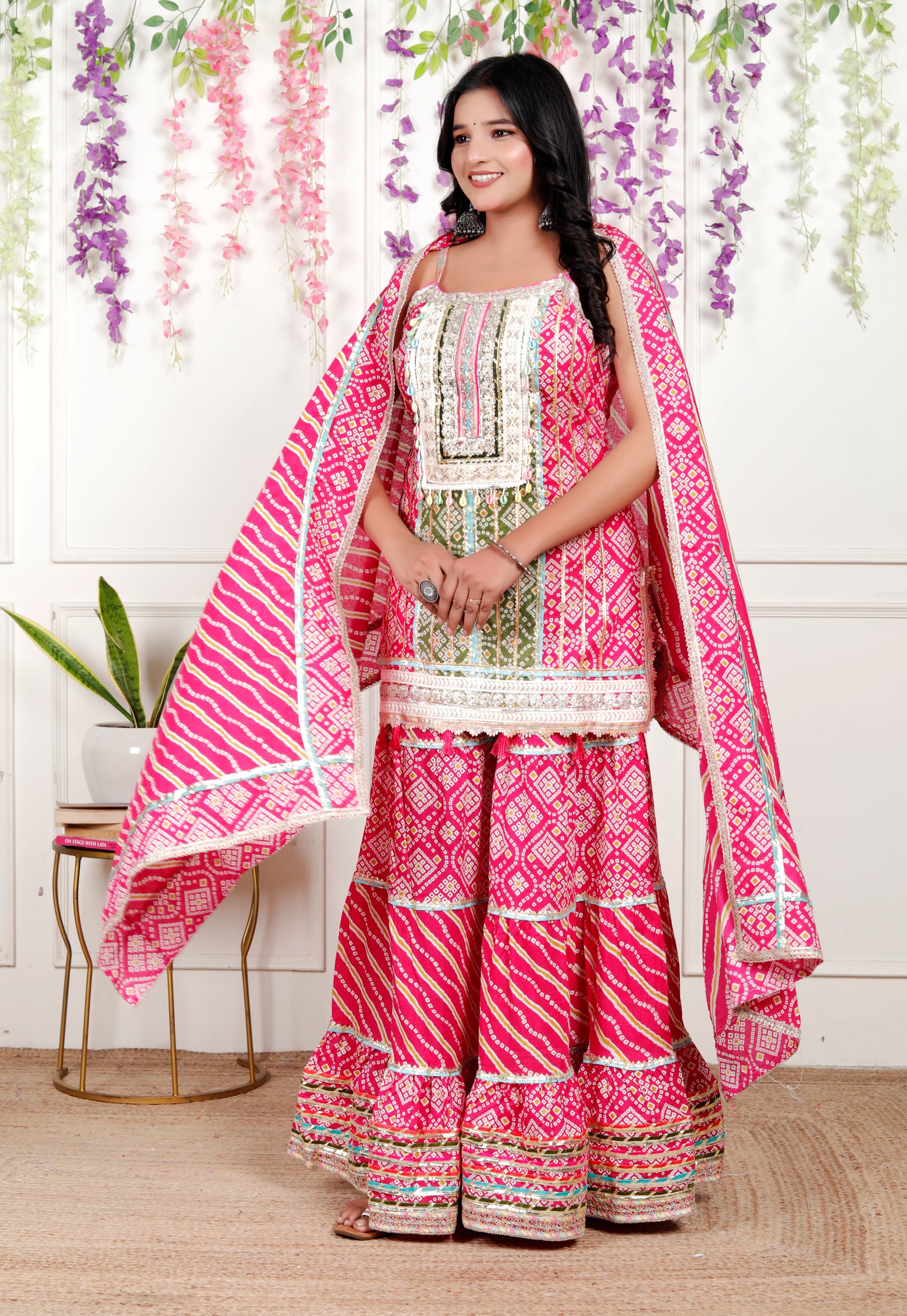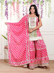 Step into elegance with our Magenta Bandhani And Lehriya Sharara, crafted from rich cotton. A perfect sharara set for Indian festivals, weddings, and celebrations. Available in sizes 34-48.