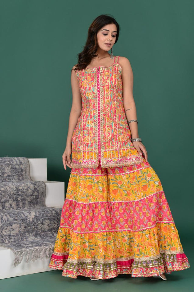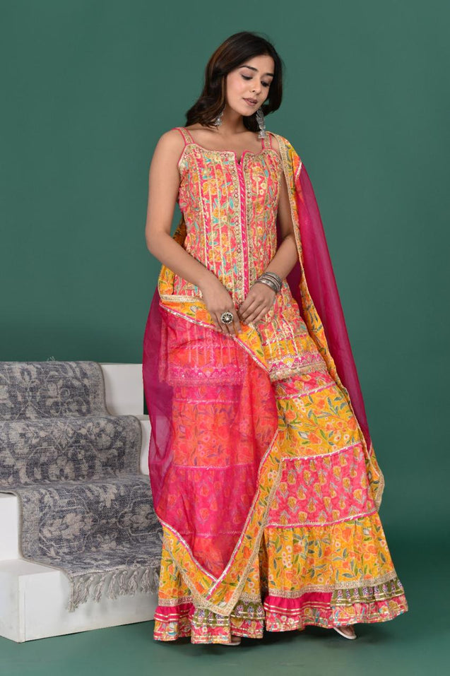 Step into elegance with our Mango Pink Sharara, crafted from rich cotton. A perfect sharara set for Indian festivals, weddings, and celebrations. Available in sizes 34-46.