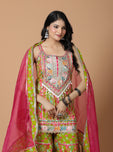 Step into elegance with our Parrot Green Sharara Set Organza Magenta Dupatta, crafted from rich cotton. A perfect sharara set for Indian festivals, weddings, and celebrations. Available in sizes 34-46.