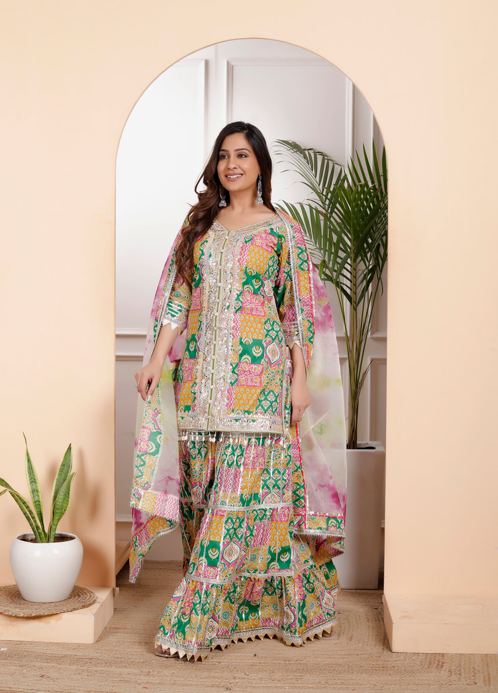Step into elegance with our Sabhya Print Sharara, crafted from rich cotton. A perfect sharara set for Indian festivals, weddings, and celebrations. Available in sizes 34-44.