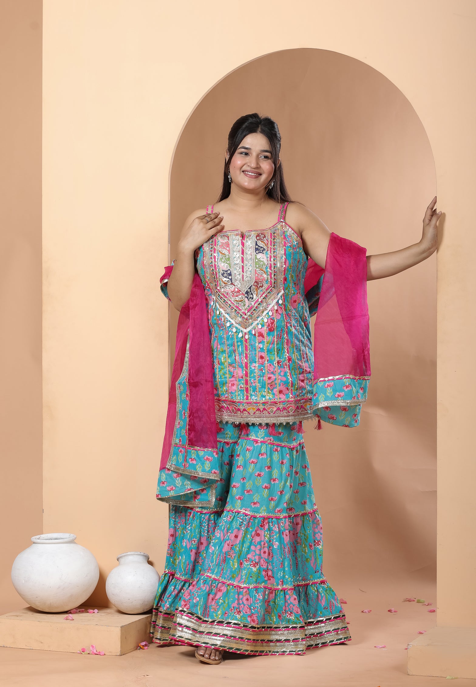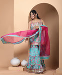 Step into elegance with our Teal Blue Sharara Set, crafted from rich cotton. A perfect sharara set for Indian festivals, weddings, and celebrations. Available in sizes 34-36.