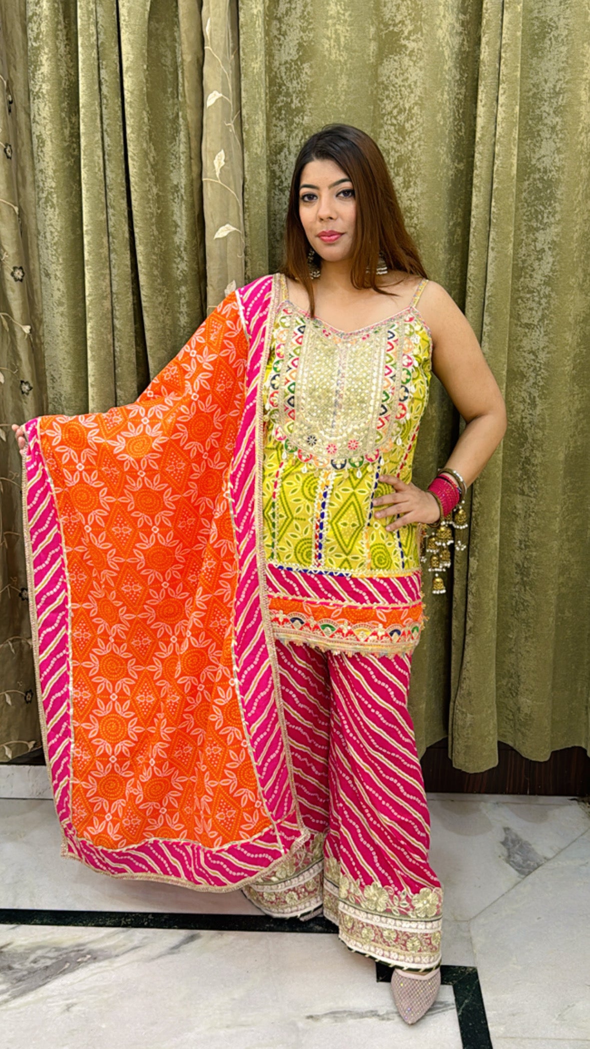 Lime Green Short Kurti with Pink Plazo & Orange Dupatta – Pure Cotton 3-Piece Set with Gota Work | Festive & Wedding Wear for Women