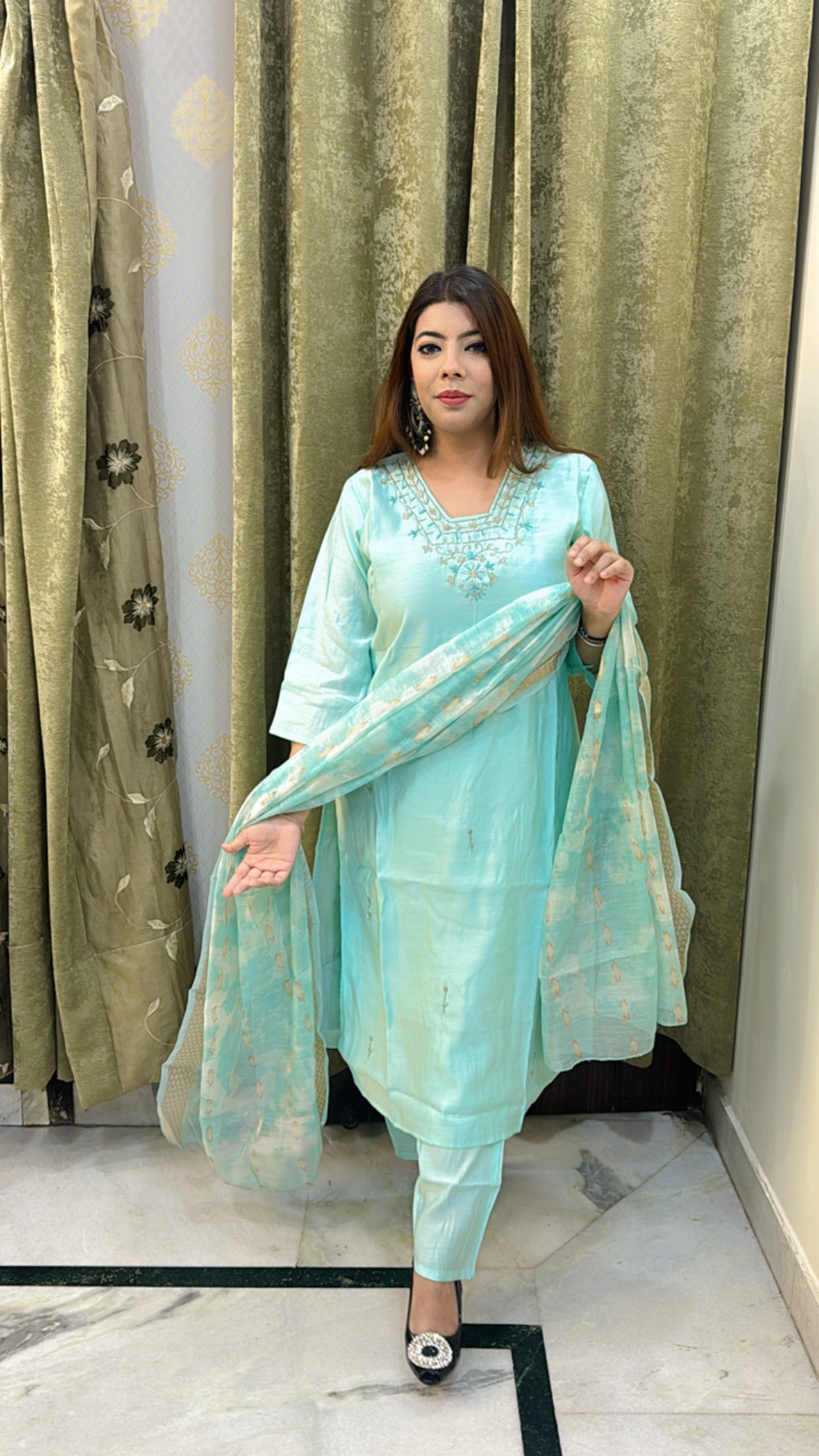 Exude effortless elegance in our aqua blue three-piece suit set, crafted from luxurious cotton silk fabric for a soft sheen and comfortable wear. The kurta features intricate hand embroidery on the neckline, adding a touch of artisanal charm. Paired with matching pants and a rich Banarasi dupatta adorned with traditional motifs, this ensemble is perfect for festive occasions, celebrations, and sophisticated gatherings. Available in sizes up to 44, it beautifully combines traditional craftsmanship with timeless style.