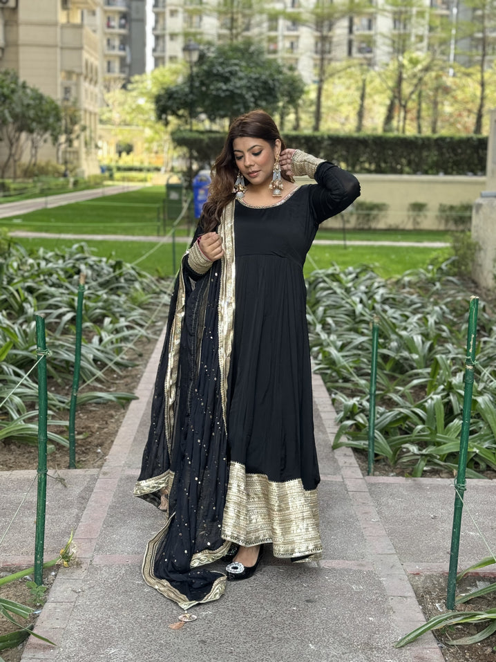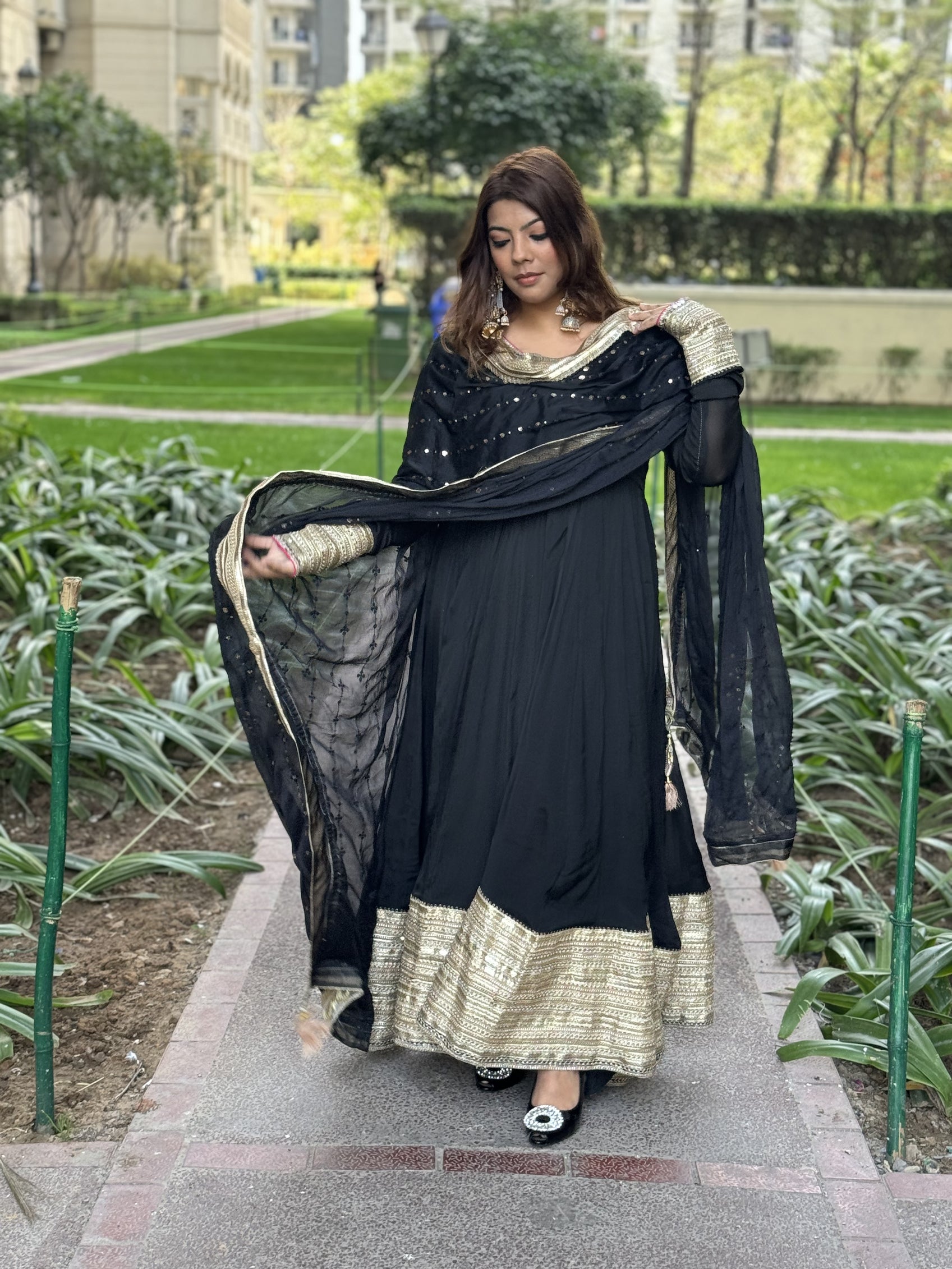 Step into elegance with our Black Chinon Anarkali, crafted from rich chinon. A perfect anarkali for Indian festivals, weddings, and celebrations. Available in sizes 34-52.