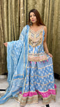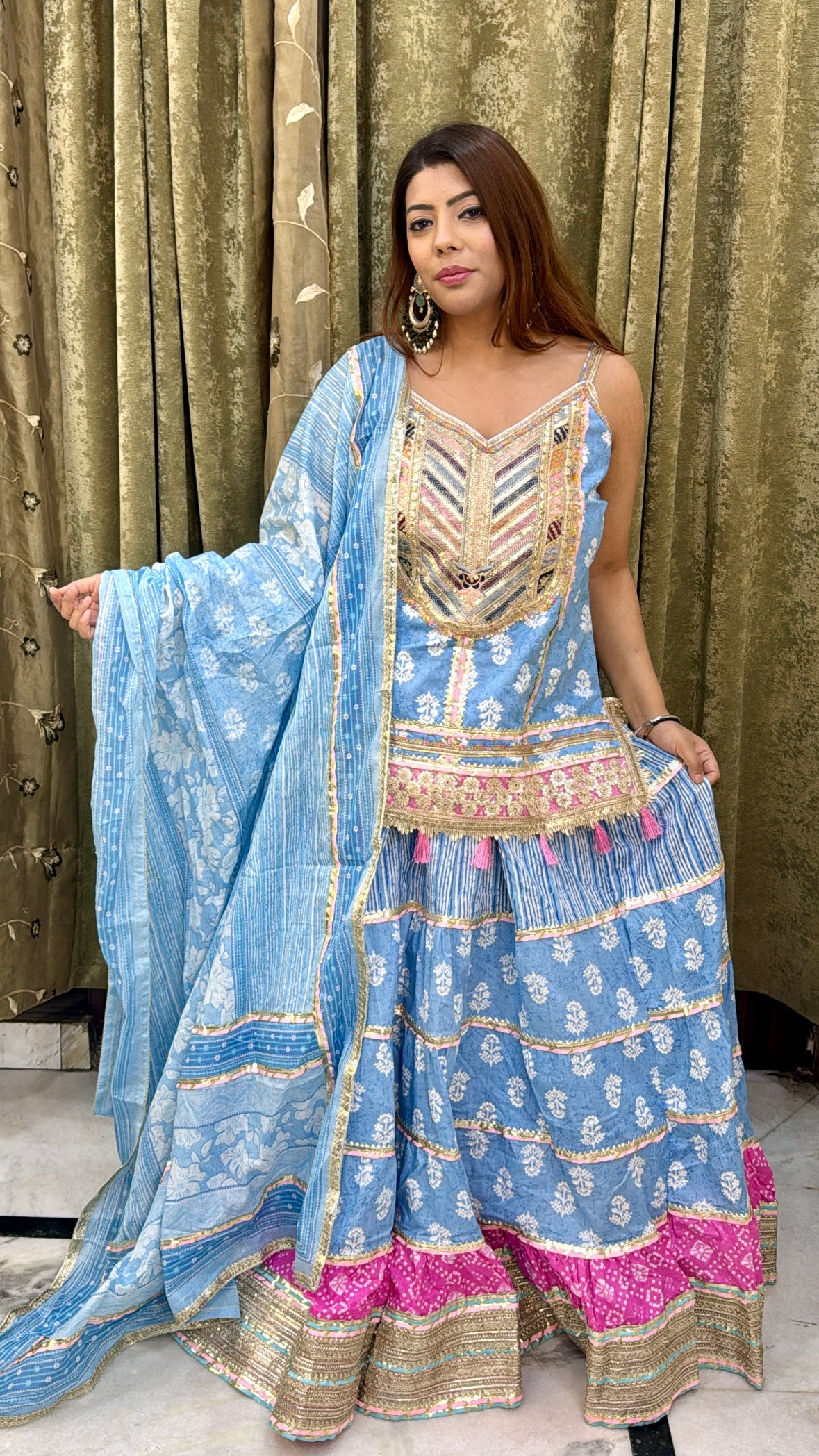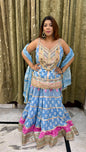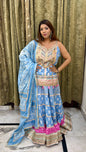 Step into elegance with this exquisite 3-piece lehenga set, crafted for festive and wedding occasions. The set features a flowing blue lehenga with delicate floral prints and striking pink border accents, paired with a long choli adorned with intricate gotta patti and sequin work. A matching lightweight dupatta with gold lace edging completes the regal look. Sleeves are provided separately, allowing you to style it as per your preference.