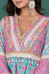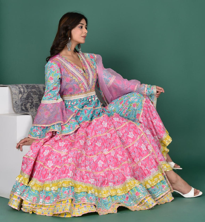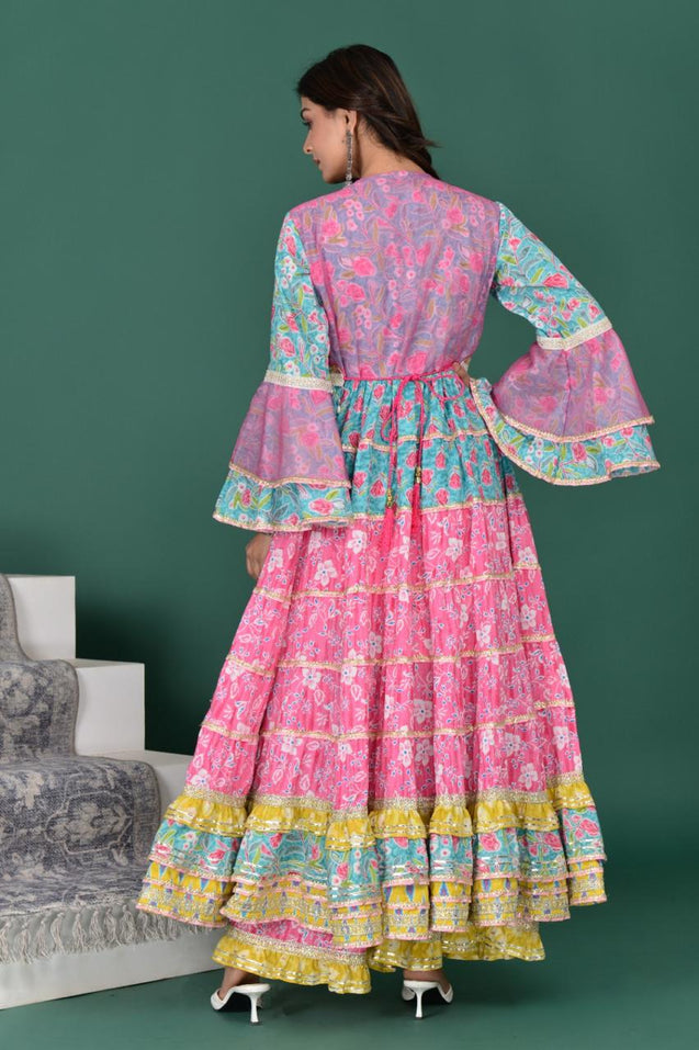 Exclusive Blue Pink Cotton Long Anarkali with Side Slit & Sharara Set – Organza Dupatta, Sizes up to 48