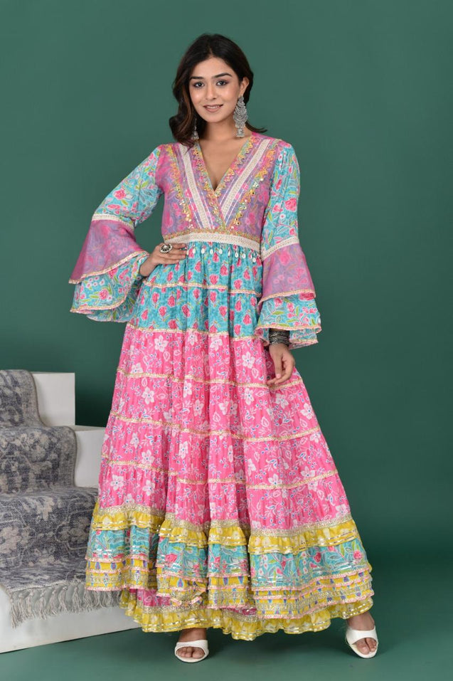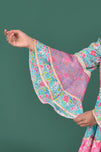 - Exclusive three-piece set: Long Anarkali, sharara, and organza dupatta