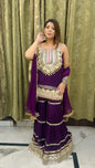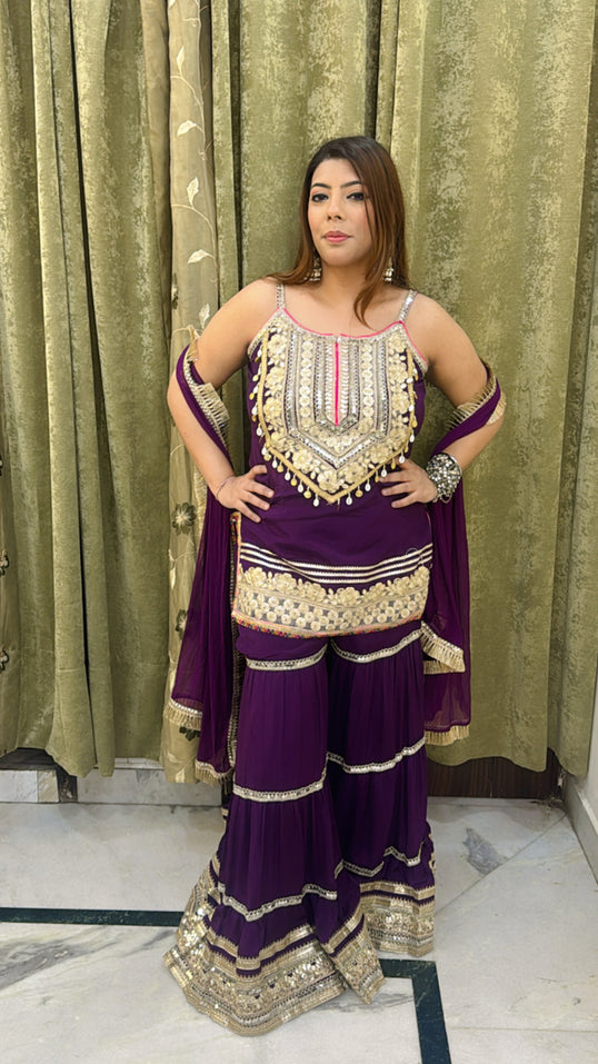 Product Description:Radiate elegance in our wine-colored three-piece Sharara suit, designed to blend traditional charm with modern sophistication. The ensemble features a stylish shirt adorned with intricate gota work detailing, a graceful Sharara, and a matching dupatta for a complete festive look. The shirt comes with separate sleeves that can be stitched as per your preference, offering style versatility. Perfect for weddings, festive celebrations, and special occasions, this Sharara suit is available in sizes 34 to 48, ensuring a flattering fit for every woman.